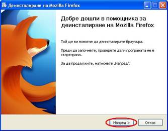 при което излиза прозорче за деинсталиране (премахване) на „Mozilla Firefox . След това, в зависимост дали Ви излиза на английски или на български, правите следното: